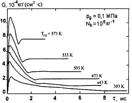 На рис.4, для различных значений 7}0 представлены расчетные данные по изменению массового расхода вскипающей воды на выходе из канала, начиная с момента разгерметизации, при истечении из большой емкости в атмосферу с противодавлением рg= 0,1 МПа. Перегретая по отношению к внешнему давлению вода содержится в емкости в состоянии насыщения. В режиме нестационарного истечения величина расхода проходит точку максимума и затем плавно стремится к стационарному значению при данной температуре. Стационарный режим устанавливается тем быстрее, чем выше начальная температура жидкости. Эти результаты представляют определенный интерес, поскольку закономерности переходного режима от нестационарного к стационарному истечению практически не рассматривались в литературе.