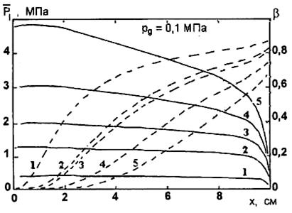 Рис.5. Распределение давления (сплошные линии) и паросодержания (пунктир) вдоль канала при стационарном истечении вскипающей жидкости при различных t/q : 1-423; 2-473; 3-503; 4-533; 5-573 К