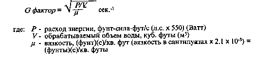 G-фактор, обычно рекомендуемый для процессов коагуляции, при продолжительности перемешивания 30 секунд составляет около 900 с-' и изменяется обратно пропорционально времени. Требуемое время перемешивания обычно определяется путем лабораторных испытаний, об этом речь пойдет ниже. Для процессов флокуляции G-фактор должен иметь более низкую величину, в пределах от " 50 для холодной окрашенной воды с очень неустойчивыми флокулами до " 200 при использовании контактного известкового умягчителя для теплой речной воды, содержащей твердые вещества. G-фактор и в этом случае должен быть определен путем лабораторных испытаний, для того чтобы выполнить расчет флокулятора с учетом возможности изменения скорости и расхода энергии в зависимости от состава речной воды и, таким образом, изменять концентрацию твердых частиц и чувствительность флокул к сдвигу.