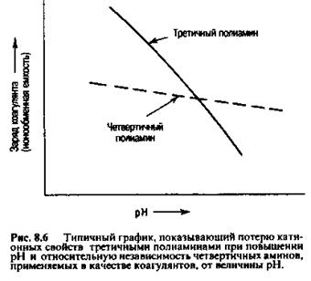 На основе вышесказанного можно сделать вывод, что катионные полимеры, как правило, используются при низких значениях рН, а анионные - при высоких. Величина рН почти не оказывает влияния на свойства неионных и четвертичных полимеров. Однако из этого общего правила не следует, что анионные полимеры не могут применяться при низких значениях рН; просто это означает, что эти полимеры уже не являются ионными. Они могут успешно использоваться в процессах флокуляции твердых частиц при низких значениях рН благодаря лишь своим неионным связям. То же самое можно сказать о катионных полимерах; даже если они при высоких значениях рН не приобретают заряда, они могут служить эффективными коагулянтами благодаря своим полярным группам.
