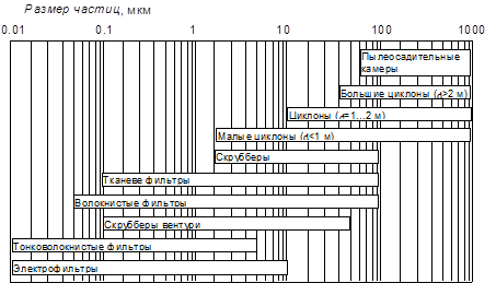 Аппараты золоочистки, точнее - уловители аэрозолей, и диапазон размеров улавливаемых ими частиц показан на рисунке 1.