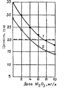 Дослід 3. Для покращення процесу озонування було застосовано коагуляційний процес. В якості коагулянту використовувався неочищений сульфат алюмінію, що був отриманий за технологією, яка була розроблена на кафедрі ТНР та ЗХТ [5].