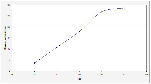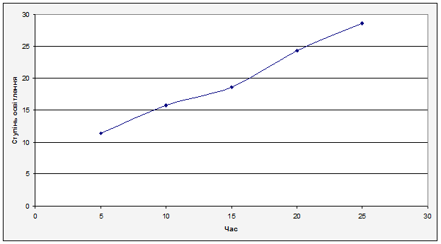 З графіку можна зробити висновок: максимальна ступінь освітлення відбувається через 25 хвилин, при цьому досягається ступінь освітлення 28,57%. Спираючись на рисунок 6.2.1 можна спостерігати чітку закономірність, та правильність проведених дослідів.
