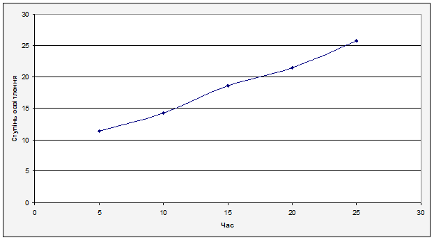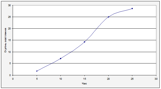 З графіку можна зробити висновок: максимальна ступінь освітлення відбувається через 25 хвилин, при цьому досягається ступінь освітлення 28,57%.