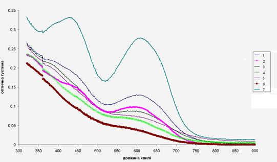 Для визначення механізму процесу були зняті спектри поглинання озонованих розчинів. На рисунку 6.2.5 подано спектри поглинання озонованих розчинів.