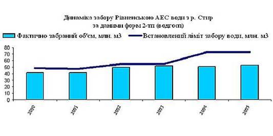 Економіко-екологічна характеристика підприємства передбачає висвітлення головних аспектів господарської діяльності підприємства в контексті її впливу на екологічну ситуацію регіону. Чотириблочна Рівненська АЕС – найбільший в області споживач води з природних джерел. За умовами дозволу станція має право без збитку для природи брати з річки Стир 2,32 куби води в секунду. Як видно на графіку, фактично станція забирає менші обсяги. Кожен куб річкової води використовується в системі охолодження Рівненської АЕС багаторазово. Проектне рішення про охолодження води в градирнях і бризкальних басейнах, а не в ставку-охолоджувачі дозволило максимально зменшити негативний вплив станції на екосистеми і зберегти багату заплаву річки Стир з луговими, чагарниковими і лісовими комплексами. Більш того, заміна водоуловлювачів градирень дозволила зберегти в 2004-2005 роках споживання води на рівні 2002-2003 років, незважаючи на збільшення виробництва електроенергії блоками №№ 1, 2, 3 і початок роботи блоку № 4.