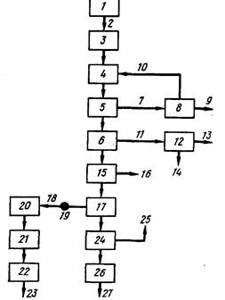 На стадии предварительной обработки 1 (рис. 1) размер частиц может быть уменьшен до требуемого для последующих операций значения — I см или менее. Материал подается в соответствующее устройство — молотковую мельницу и затем просеивается. Частицы с большим размером чем это необходимо возвращаются в повторное измельчение. Удовлетворяющий требованиям мелкозернистый материал подается на обработку серной кислотой.