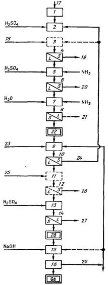 В предпочтительном варианте процесса жидкая фракция после стадии разделения 10 первоначально подвергается обработке для осаждения алюминия (стадия 11), после чего проводится разделение жидкости и твердого остатка 12. На стадии // алюминий осаждается в виде алюмината кальция. Кальциевое соединение добавляется к жидкости после операции 10 в виде известкового молока или гидроксида кальция, обычно в количестве, в 1—2 раза превышающем стехиометрическое. Значение рН должно поддерживаться для предотвращения осаждения галлия. Температура должна составлять 60—100 °С. Смесь перемешивается в течение 2 ч или более для полного завершения реакции и затем подвергается разделению на стадии 12. Твердый остаток отделяется и промывается, затем выводится из процесса; раствор галлата обрабатывается в осадителе 13 для получения обогащенного галлиевого концентрата, после чего проводится разделение на стадии 14 так же как описано выше.