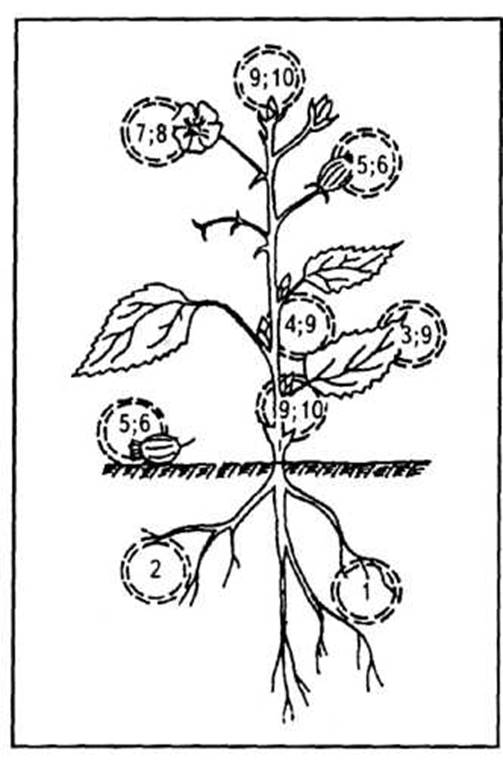 Рис. 1. Екологічні ніші серед фітофагів: 1 — коренеїди; 2 — ті, що поїдають кореневі виділення; 3 — листоїди; 4 — стовбуроїди; 5 — плодоїди; 6 — насіннєїди; 7 — квіткоїди; 8 — пилкоїди; 9 — сокоїди; 10 — брунькоїди