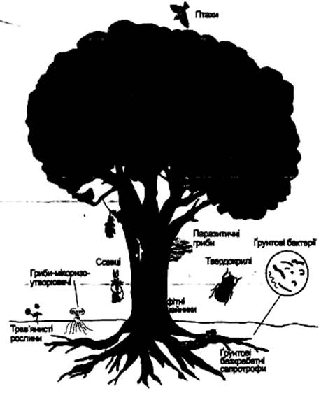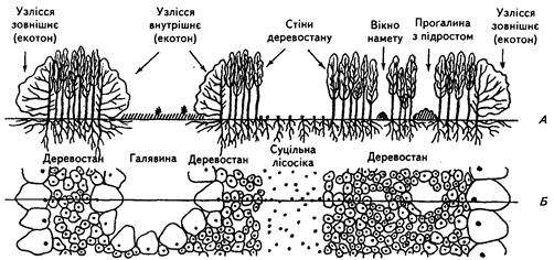 Рис. 5. Вертикальна (А) і горизонтальна (Б) структури лісового біоценозу.