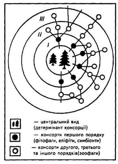 Характерною особливістю цих об'єднань є те, що вони звичайно формуються на базі популяцій автотрофних рослин (сосна, смерека, береза, пшеничне чи картопляне поле тощо). Такі популяції називають детермінантами, а види, які об'єднуються довкола них, — консортами. На рис. 1 зображено консортне об'єднання, сформоване довкола ядра, яким стала трав'яниста рослина, даючи поживу численним фітофагам. Звичайно консорцію зображають у вигляді концентричної фігури (рис. 3) з рослиною-ядром (детермінантом) та оточуючими його консортами, які, в свою чергу, утворюють консорти першого, другого, третього порядку і т.ін.