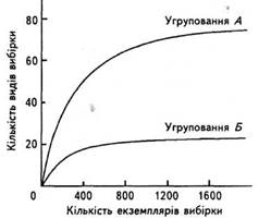 Рис. 4. Залежність видового багатства чисельності окремих організмів у двох гіпотетичних угрупованнях. В угрупованні А видове багатство значно вище, ніж в угрупованні Б.