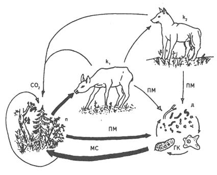 Рис. 7. Взаємозв'язок продуцентів (п) з консументами 1-го порядку (к,), консументи 2-го порядку (Ц) та деструкторами (д) і ґрунтовими консументами (ГК); ПМ — продукти метаболізму, мертвий відпад; МС — мінеральні солі