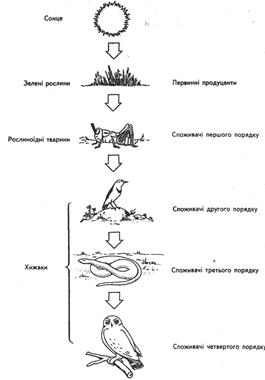 Рис. 8. Спрощений наземний кормовий ланцюг, який показує послідовність трофічних рівнів
