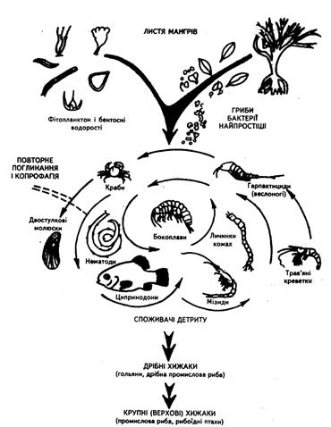 Рис. 9. Детритний харчовий ланцюг, заснований на листках мангрових дерев, що падають у мілководний естуарій на півдні Флориди