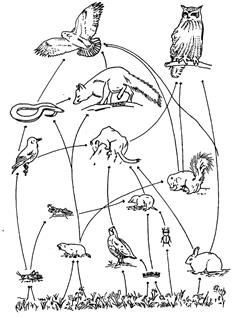Будь-яке угруповання можна представити у вигляді кормової мережі, яка являє собою схему всіх трофічних зв'язків між видами, що входять до складу цього угруповання. Кормова мережа звичайно складається із декількох ланцюгів живлення, кожний з яких є окремим її каналом (рис.7).