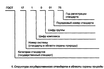 Обозначения государственных стандартов состоят из номера системы по классификатору, шифра комплекса, шифра группы, порядкового номера стандарта и года его регистрации. Первый разработанный стандарт ГОСТ 17.0.0.01–76 «Система стандартов в области охраны природы и улучшения использования природных ресурсов. Основные положения» был введен 01.01.1977 г. и установил систему стандартов, направленных на охрану природы.