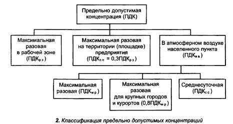 Для предотвращения отрицательных последствий воздействия загрязняющих веществ на атмосферу, литосферу и гидросферу необходимо знать их предельные уровни, при которых обеспечивается нормальная жизнедеятельность. Информация, характеризующая состояние природной среды, оценивается с помощью специально разработанных критериев или нормативов. Основной величиной экологического нормирования качества природной среды является предельно допустимая концентрация вредного вещества или веществ в биосфере – воздухе, воде и почве. В общем случае ПДК – это такое содержание ВВ в окружающей среде, которое при постоянном контакте или воздействии за определенный промежуток времени практически не влияет на здоровье человека и не вызывает неблагоприятных последствий у его потомства. ПДК должны устанавливаться на основе различных токсикометрических оценок, с раздельным нормированием уровней загрязнения, например, воздуха, в рабочих зонах и в населенных пунктах. На рис. 2. приведена классификация ПДК.
