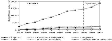 В настоящее время среднее потребление пресной воды составляет около 630 м3 на человека в год, из них 2/3 или 420 м3 расходуется в сельском хозяйстве на производство продуктов питания (125 м3 – на коммунально-бытовые нужды, 65 м3 – на производство промышленной продукции). Таким образом, режим питания среднего жителя планеты в большей степени все еще основывается на растительной пище и далек от рекомендуемого, а производимый мировой объем продовольствия даже в валовом исчислении недостаточен для нормального обеспечения населения планеты. Наибольшее потребление воды наблюдается в регионах с наибольшей численностью населения – основные объемы воды поглощают хозяйства азиатских стран, где проживает половина мирового населения.