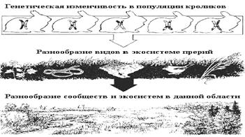 Генетическое разнообразие (наследственную изменчивость внутри каждого вида), видовое разнообразие (набор видов в данной экосистеме) и разнообразие сообществ/экосистем (местообитаний и экосистем в данной территории)
