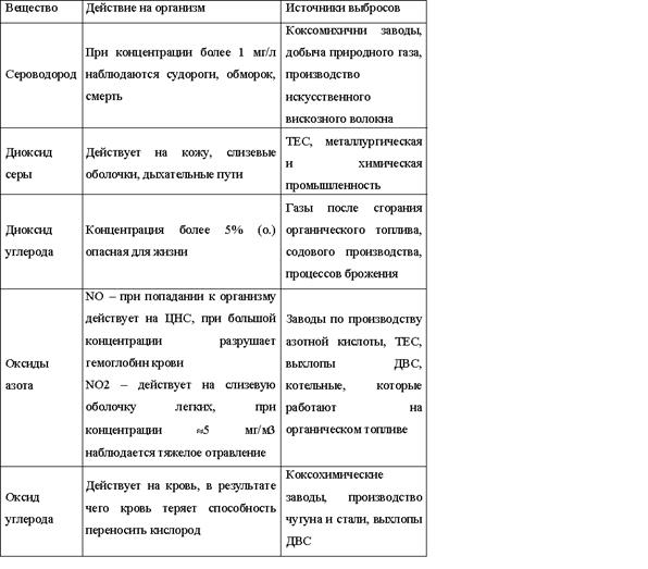 В таблице 2 приведена характеристика некоторых вредных веществ, их действие на организм человека и указаны источники выбросов, от которых они попадают в атмосферный воздух.[3,32]