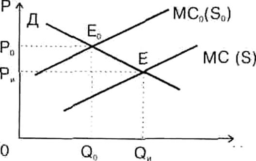 В общем виде процесс интернализации внешних эффектов сводится к сведению частных предельных (дополнительных) издержек, не включающих затраты на возмещение ущерба (MC) в общественные предельные издержки (то во что обходится производство товара обществу) (MC ). Иначе говоря, должно быть смещение кривой предложения (S) с целью оптимизации цены на товар, производство которого загрязняет окружающую среду.
