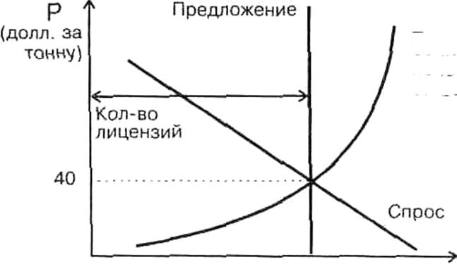 На основе сочетания принципов нормативного и платного природопользования возможно функционирование “рынка прав на загрязнения” (рынок лицензий на загрязнение). Графическая интерпретация такого рынка на основе спроса и предложения представлена в нижеидущем рисунке.