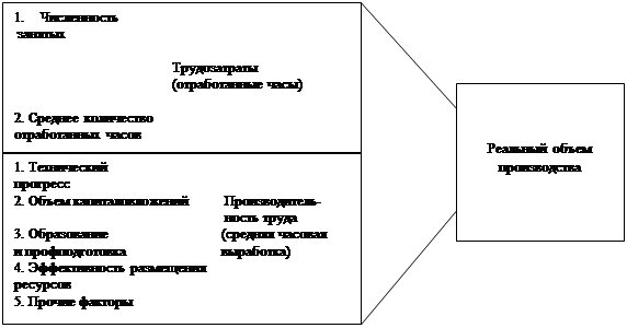 Эта схема показывает, что увеличение реального продукта и дохода может осуществляться двумя основными способами: (1) путем вовлечения большего объема ресурсов и (2) путем более производительного их использования. Рассмотрим, прежде всего, рост трудозатрат. Можно сказать, что реальный ВНП в любое время определяется как трудозатраты (в человеко-часах), умноженные на производительность труда (реальная часовая выработка на одного занятого). То есть