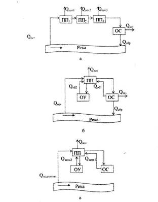 а) повторно-последовательная; б) оборотная; в) замкнутая ПП - производственный процесс: ОС - очистные сооружения; ОУ - охладительные установки; QИст