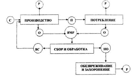 С - первичное сырье, П - продукция. Р - рассеивание в окружающей среде газообразных и жидких отходов, О - твердые отходы, BMP ~ вторичные материальные ресурсы, ВС -вторичное сырье, НО - неутилизируемые отходы.