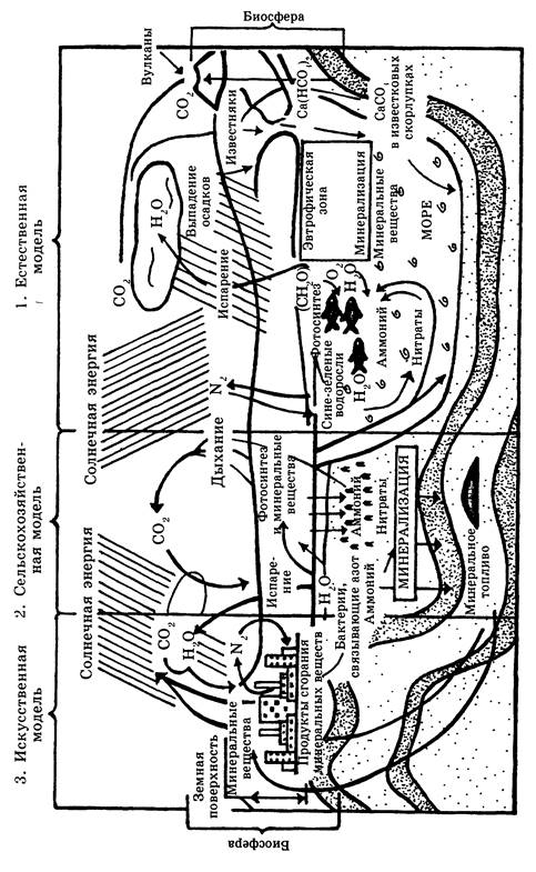 Человек в конкурентной борьбе за выживание в природной среде начал строить свои искусственные антропогенные экосистемы. Примерно 10 000 лет назад он перестал быть «рядовым» консументом, собирающим дары природы, и начал эти «дары» получать сам, посредством своей трудовой деятельности, создав сельское хозяйство. Освоив сельскохозяйственную модель, человек исторически подошел к промышленной революции, которая началась всего 200 лет назад, и до современного комплексного взаимодействия с окружающей средой по искусственной модели (рис. 1). На современном этапе он для удовлетворения своих все возрастающих потребностей вынужден изменять природные экосистемы и даже разрушать их, возможно, и не желая этого.