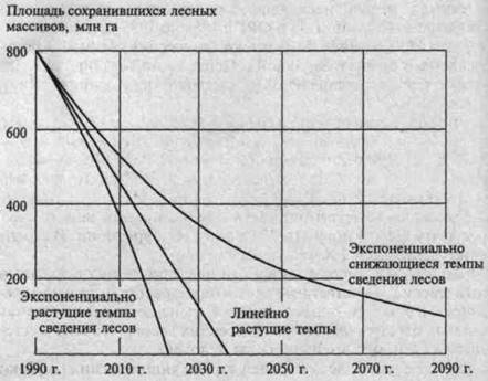 Оценки будущих потерь тропических лесов зависят от предполагаемых тенденций изменения структуры и численности населения, совершенства законодательства и экономического развития. Три сценария, отраженные на рисунке, показывают возможные модели будущего в случае, если не будут предприняты согласованные и эффективные меры по защите сохранившихся лесов. Если первоначальный ущерб в 17 млн га в год будет возрастать вместе с численностью населения примерно на 2,3% в год, то тропические леса исчезнут к 2020 г. Если потери останутся на уровне 17 млн га в год, то леса исчезнут к 2040 г. Если потери будут составлять 2,1% в год от остающейся лесопокрытой площади, то тропические леса будут исчезать на протяжении более 100 лет.