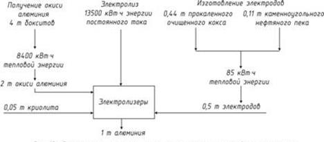 Расход материалов и энергии на производство 1 т алюминия приведен на рис.