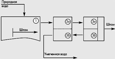 ). Эти компоненты присутствуют во всех природных водах, и их содержание составляет 90–95% общего количества ионов. Органические вещества присутствуют в виде эмульсий минеральных масел и нефтепродуктов, попадающих в водоемы со сточными водами, а также в виде гумусовых соединений и микроорганизмов, придающих воде цветность. Жесткость воды колеблется в широких пределах – от нескольких десятых до десятков мг-экв/л. Например, для реки Москвы жесткость у истока составляет 0,5–0,9 мг-экв/л, а в месте впадения реки Можайки – 6–7 мг-экв/л. Величина показателя рН природных вод обычно варьируется в пределах 6,5–8,5. Технология подготовки природных вод предполагает электрохимическую коррекцию рН очищаемой воды и электрофлотационное разделение жидкой и твердой фаз. На рисунке представлена технологическая схема электрохимической подготовки природных вод. Вода поступает в сборник-отстойник (1) для выделения тяжелых минеральных примесей (главным образом песка) и грубодисперсных частиц (структурных примесей растительного и животного происхождения). После предварительной очистки сток подается в катодную камеру (2а) электрокорректора рН, из которой под действием электрического тока анионы мигрируют через анионообменную мембрану в анодную камеру (2б), где происходит подкисление среды. В катодной камере в процессе электролиза воды раствор подщелачивается до рН=10–11, что сопровождается образованием частиц гидроксидов и карбонатов смешанного состава. Далее сток поступает в камеру грубой очистки (3а) и тонкой очистки (3б) электрофлотатора, где в результате электролиза воды происходит образование пузырьков газов водорода и кислорода, которые, поднимаясь вверх, сталкиваются с частицами примесей (гидроксиды и карбонаты металлов, эмульсии, дисперсные органические вещества), флотируют их на поверхность, образуя устойчивый пенный слой – флотошлам, периодически удаляемый шламосборным устройством. После осветления умягченная вода направляется в анодную камеру (2б) электрокорректора рН, где происходит нейтрализация воды до величины показателя рН, практически не отличающейся от величины рН исходной воды. После обработки умягченная и очищенная вода поступает на технологические нужды.