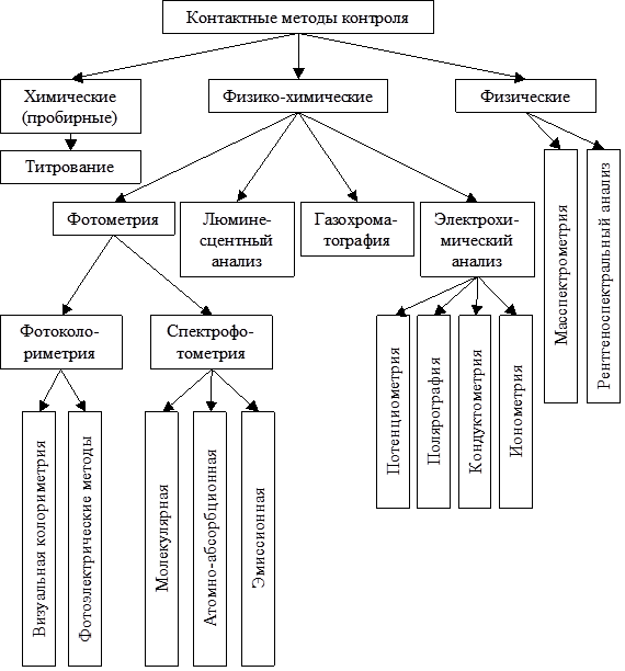 Средства экологического мониторинга подразделяются на контактные и неконтактные; а контролируемые показатели на функциональные (продуктивность, оценка круговорота веществ и др.) и структурные (абсолютные или относительные значения физических, химических или биологических параметров: концентрация загрязняющего вещества, коэффициент суммарного загрязнения и др.). Контактные методы контроля подразделяются на методы, использующие прямое измерение параметра и косвенное (рис.1).