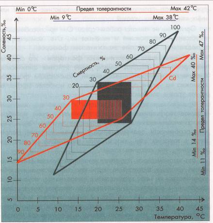 . Если в воду добавляется токсичный для ракообразных кадмий, то экологический оптимум смещается: температура лежит в интервале от 13 до 26°С, а соленость - от 25 до 29%. Изменяются и пределы толерантности. Разница между экологическим максимумом и минимумом для солености после добавки кадмия уменьшается с 11- 47% до 14-40%. Предел толерантности для температурного фактора, наоборот, расширяется с 9 - 38°С до 0 - 42°С.
