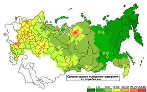 и NO составляют ежегодно — более 255 млн. т. По данным Росгидромета, ежегодно на территории России выпадает не менее 4.22 млн.т серы, 4.0 млн.т. азота (нитратного и аммонийного) в виде кислотных соединений, содержащихся в атмосферных осадках. Как видно из рисунка 10, наибольшие нагрузки серы наблюдаются в густонаселенных и индустриальных регионах страны.