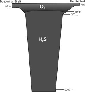 Тонкий верхний слой морской воды (до 150 м) поддерживает уникальную биологическую жизнь в экосистеме Черного моря. Более глубокие и плотные водные слои насыщены сероводородом, запасы которого накопились за тысячи лет вследствие распада органических соединений в Черном море. Уникальная геоморфологическая структура и гидрохимические условиясформировали биоценозы, в основном на уровне простейших, бактерийи некоторых многоклеточных беспозвоночных, населяющих глубоководные слои. Знание о биологических формах жизни в глубоководных слоях Черного моря очень ограничено. Нарушение естественного равновесия между этими двумя слоями может нанести непоправимый вред людям и экосистеме Черного моря. (Рис. 2).