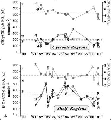 Оценка временных изменений биогенов в последние годы показала, что истощение NO3