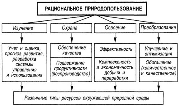 (разумное) природопользование — хозяйственная деятельность человека, обеспечивающая экономное использование природных ресурсов и условий, их охрану и воспроизводство с учетом не только настоящих, но и будущих интересов общества.В основе рационального природопользования и охраны природы лежат следующие мотивы (аспекты): экономический, здравоохранительный, эстетический, научно-познавательный, воспитательный.Рациональное природопользование и охрана природы должны основываться на следующих принципах:1.Правило прогнозирования: использование и охрана природных ресурсов должны осуществляться на основе предвидения и максимально возможного предотвращение негативных последствий природопользования.2.Правило повышения интенсивности освоения природных ресурсов: использование природных ресурсов должно осуществляться на основе повышения интенсивности освоения природных ресурсов, в частности, с уменьшением или устранением потерь полезных ископаемых при их добыче, обогащении и переработке, транспортировке.3.Правило множественного значения объектов и явлений природы: использование и охрана природных ресурсов должны осуществляться с учетом интересов разных отраслей хозяйства.4.Правило комплексности: использование природных ресурсов должно осуществляться комплексно, разными отраслями народного хозяйства;5.Правило региональности: использование и охрана природных ресурсов должны осуществляться с учетом местных условий. 6.Правило косвенного использования и охраны: использование или охрана одного объекта природы может приводить к косвенной охране другого, а может приносить ему вред.7.Правило единства использования и охраны природы (основной принцип): охрана природы должна осуществляться в процессе ее использования. |