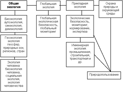 Сравнительно недавно появился такой раздел экологии как «глобальная экология». Она рассматривает экологические процессы и современные тенденции развития биосферы на глобальном уровне; изучает воздействия, которые имеют значение для выживания всего сообщества людей, сохранения популяции вида Homo sapiens и современной цивилизации. Деление экологии на основные разделы изображено на рисунке 1.1.