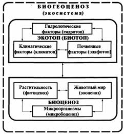 В свою очередь экотоп состоит из климата во всех многообразных его проявлениях и геологической среды (почв и грунтов), называемой эдафотопом. Эдафотоп - это то, откуда биоценоз черпает средства для существования и куда выделяет продукты жизнедеятельности.