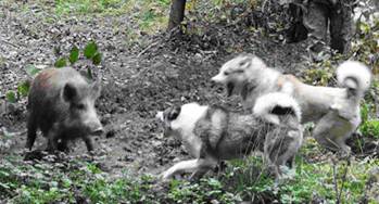 Роль собак на этой охоте состоит в том, чтобы задержать зверя на месте до подхода охотника (рисунок 2). Охота на кабана требует злобных и сильных собак. Две-три такие лайки, беспрерывно нападая на кабана, заставляют его кружить на одном месте, останавливаться, отбиваясь от наседающих собак. Секач при этом сам переходит в нападение и, если собаки недостаточно осторожны и ловки, ранит, а иногда и убивает их своими клыками. Особенно трудна и опасна для собак охота в густых зарослях и заболоченных местах. Некоторые охотники используют для охоты на кабана гончих собак. Как правило, это оканчивается гибелью собак. Гончие не столь подвижны, как лайки, и не могут вовремя увернуться от кабаньих клыков.