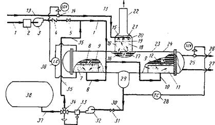 Скорость подачи свежей воды по линии 13 (через жиклер 20) регулируется вентилем 14, управляемым уровнемером 36, связанным с холодильником 23.