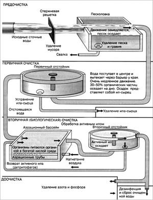 Выпадающий фосфат кальция удаляют фильтрованием. Удаление азота. В сточных водах содержится много связанного азота. Как и фосфаты, соединения азота ускоряют рост водорослей. Аммиак удаляется из сточных вод аэрацией (удается извлечь до 92% аммиака). Для очистки от нитратов применяют коагуляцию соединениями железа и известью с последующей фильтрацией осадков либо адсорбцию ионообменными смолами. Бактериальные фильтры и водоросли для очистки от органических веществ. В фильтрах используют следующие бактерии: Proteus № 9, Saccharomyces Torulopsis (Candida Utilis), Trichosporan, Pseudomonas № 14, Rhodoturola. Обычно применяют смесь бактериальных фильтров, нанесенных на керамзит. При очистке воды эффективны также водоросли, поглощающие из воды органические вещества: Ankystrodesmus, Pharmidium, Pediastrum. Принцип очистки водорослями состоит в использовании питательных веществ, находящихся в сточных водах. Водоросли собирают с поверхности водоема и удаляют. Очищенная таким образом вода соответствует по своему качеству стандартам на питьевую воду.
