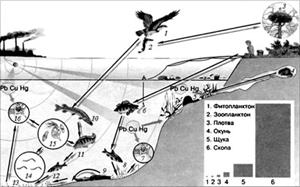 Рис. 2.Накопление тяжелых металловпо цепям питания в пресноводном биоценозе:1 – скопа; 2, 10 – щука; 3 – гнездо скопы; 4, 5 – ондатра; 6, 11 – окунь;7, 13, 16 – бактерии и фитопланктон; 8, 12 – плотва; 9 – речной рак;14 – мотыль; 15 – зоопланктон