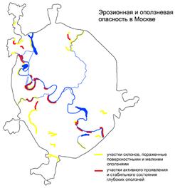 Современные процессы в бассейнах технопогребенных рек качественно отличаются от протекавших здесь ранее естественных процессов . На ранних этапах освоения бассейнов в них господствовали плоскостной смыв, речная и овражная эрозия и аккумуляция, низкие берега заболачивались. На крутых бортах долин нередко происходили оползни. В эпоху интенсивного освоения овраги исчезают, заболачивание сменяется подтоплением. Плоскостной смыв происходит на открытых, лишенных покрытия участках, часто ограничиваясь смывом мусора с асфальтового покрытия. Ведущими процессами становятся суффозия, а также уплотнение заполняющих долины техногенных отложений. Для естественных ландшафтов Московского региона интенсивное проявление этих процессов маловероятно. На поверхности суффозионные процессы и уплотнение проявляются в виде локальных просадок асфальтового покрытия дорог, деформаций поверхности около канализационных коллекторов и зданий, в районе теплотрасс и других коммуникаций. В ряде случаев на склонах засыпанных долин продолжаются склоновые процессы. Они могут активизироваться под влиянием дополнительной нагрузки со стороны расположенных на склонах зданий, что, в свою очередь, приводит к повреждениям последних. Также необходимо учитывать возможную активизацию карстово-суффозионных процессов,— особенно в местах, где сильно размыты или отсутствуют юрские глины, перекрывающие сильно закарстованные отложения карбона и предохраняющие их от дальнейшего разрушения. В условиях слабых грунтов в глубоких котлованах и подземных выемках (например, при прокладке линий метрополитена) возникают плывуны . [5]