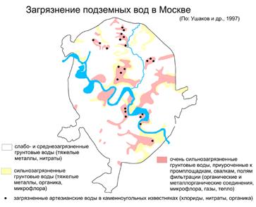 Повсеместно в Подмосковье, а особенно - в Москве, отмечается ухудшение качества подземных, особенно, грунтовых вод (ближайший к поверхности водоносный слой), их химическое и бактериологическое загрязнение. Типичные загрязнители - нефтепродукты, железо, марганец, свинец, алюминий, кадмий. Например, в зоне Московского нефтеперерабатывающего завода (Капотня) загрязнение подземных вод нефтепродуктами превышает предельно допустимую концентрацию в 50 раз. (см. рис.8)