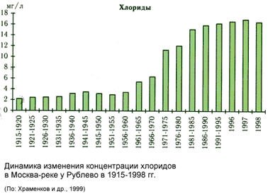 По данным анализов Москвы-реки у Рублево: с 1915 по 1998 концентрация хлоридов (показатель загрязнения хозяйственно-бытовыми стоками) выросла в 10 раз, при чем подъем произошел в 1950-х гг. в связи с развитием сельского хозяйства и городского строительства. Основной рост содержания нитратов произошел в 1985-1990 гг. в период химизации сельского хозяйства. С 1975 по 1998 гг. (раньше не наблюдали) концентрация меди увеличилась в 3 раза, лития — в 4, хрома — в 13, кадмия — в 10, свинца — в 5, бария — в 2, кобальта — в 2.5. (см. рис. 7)