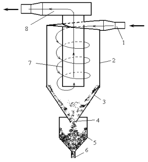 Циклоны наиболее часто применяют в промышленности для осаждения твердых аэрозолей. Циклоны можно использовать для очистки газа при высоких температурах и давлениях. Они не имеют движущихся частей, что повышает надежность в эксплуатации. Принцип работы циклона основан на создании вращательного движения запыленного газа, в котором возникают центробежные силы, действующие на частицы пыли по направлению к стенкам циклона. Запыленный воздух поступает в циклон через патрубок 1, очищенный – удаляется через выхлопную трубу 7 и улитку 8. Газовый поток подается в цилиндрическую часть циклона 2 тангенциально, описывает спираль по направлению к дну конической части 3 и затем устремляется вверх через турбулизованное ядро потока у оси циклона на выход. Крупные пылевые частицы (более 100 мкм) под действием центробежных сил движутся у стенок корпуса, а мелкие частицы (менее 10 мкм) – на некотором расстоянии от стенок. Достигнув уровня прорезей в стенках корпуса, крупные пылевые частицы с частью воздуха удаляются из корпуса через отверстия 4 в пылесборник 5. Здесь происходит сепарация частиц, и они через патрубок 6 удаляются. Мелкие пылевые частицы продолжают движение в составе воздушного потока в корпусе циклона, а затем в пылесборнике. Мелкие частицы совместно с крупными покидают аппарат через пылевыпускной патрубок. Воздушный поток через выхлопную трубу выходит из аппарата.